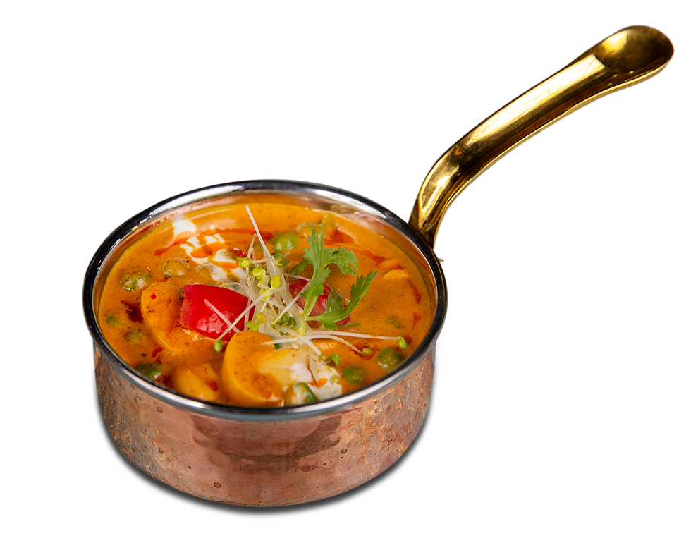 Dices of mushroom, Green peas tossed with fresh ground aromatic spices with onion & cashew gravy.